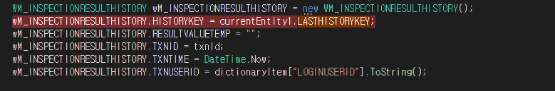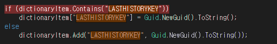HISTORYKEY 에 currentEntity1.LASTHISTORYKEY 값을 받도록 되어있는데 이부분을 그냥dictionary["LASTHISTORYKEY"] 값을 받아오도록 바꾸면 중복키 오류가 해결될 것이다. dictionaryItem["LASTHISTORY"] 에는 Guid.NewGuid().ToString()으로 생성한 값이 재대로 들어가 있기 때문이다.