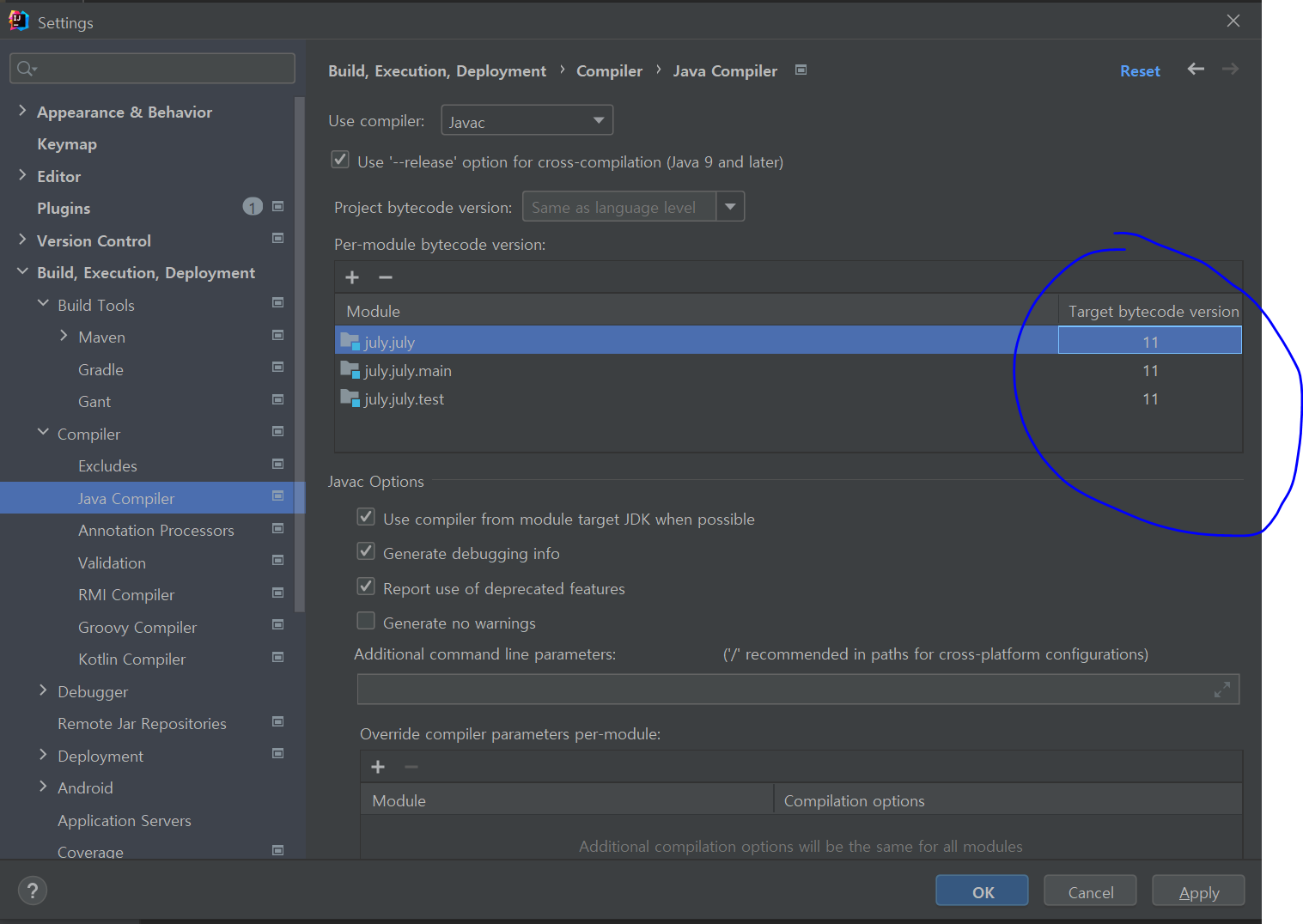 다음 Compiler > Java Compiler에서 Target bytecode version을 맞춰준다.