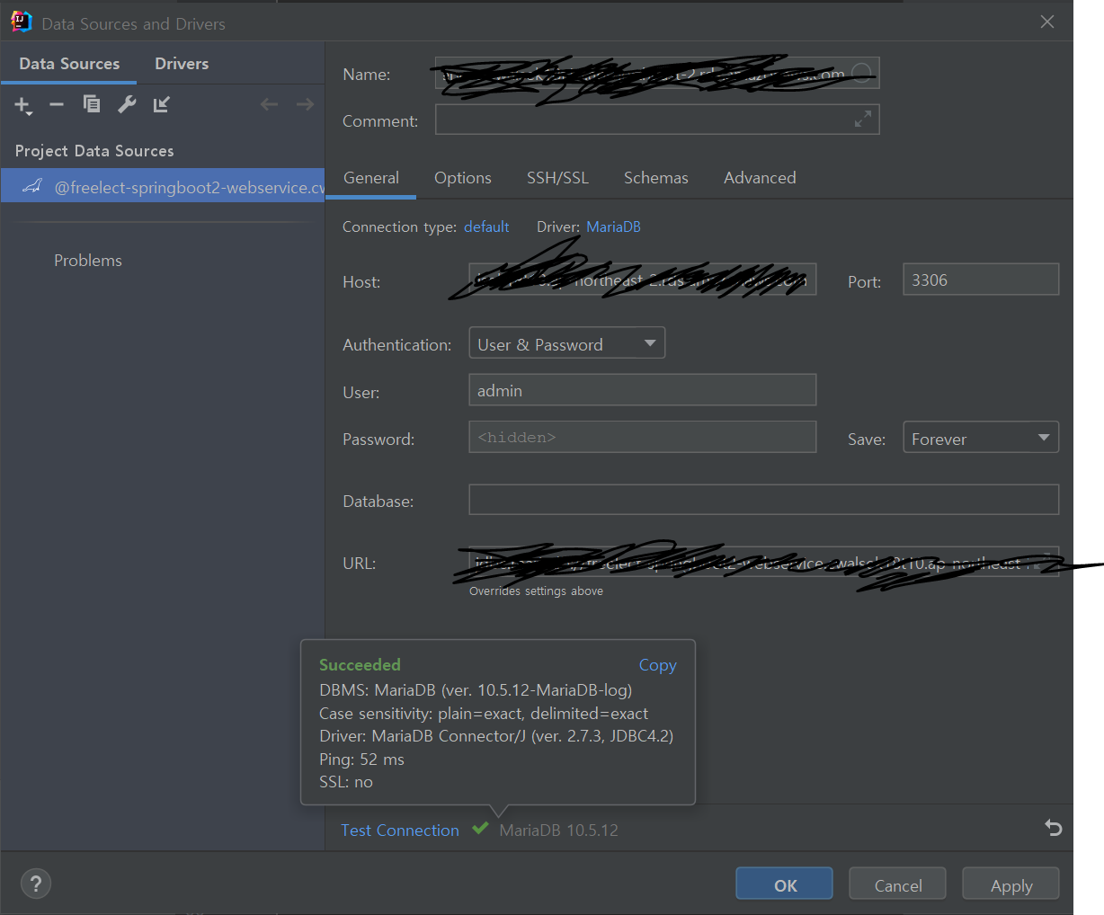 인텔리제이 우측의 기본 database에서 연결할 경우 잘되지만
