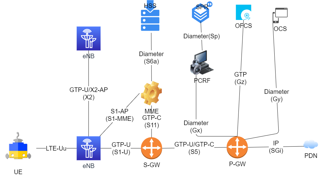 | Gx | Diameter | PCRF와 P-GW간 인터페이스로 제어 평면을 정의한다. QoS 정책 및 과금 제어를 위한 인터페이스로 정책 제어 규칙 및 과금 규칙을 전달한다. |