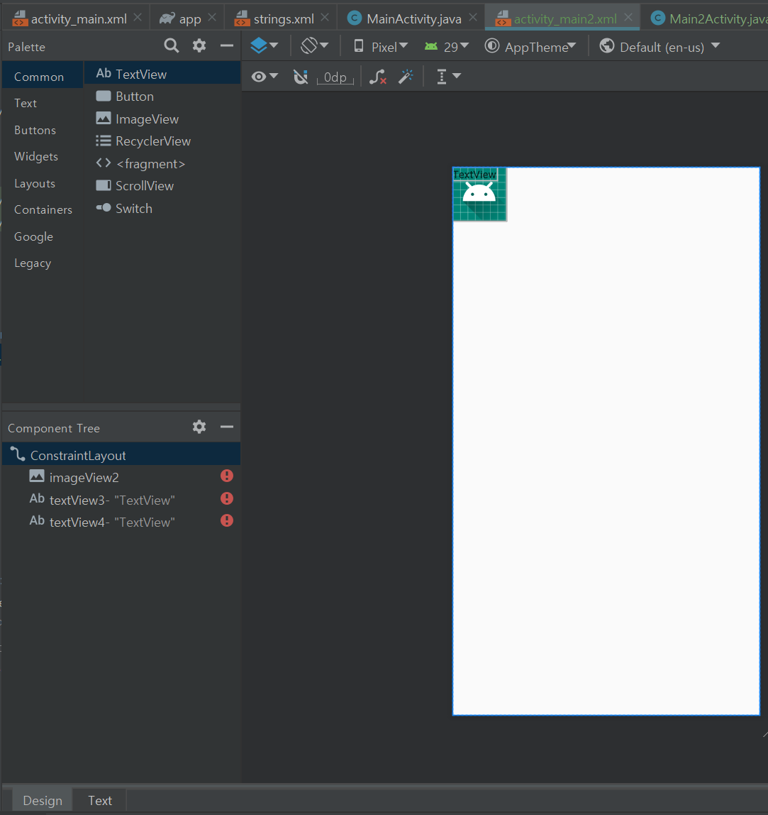 컴포넌트 트리에 위와 같이 이미지 뷰와 텍스트 뷰 2개를 등록합니다.