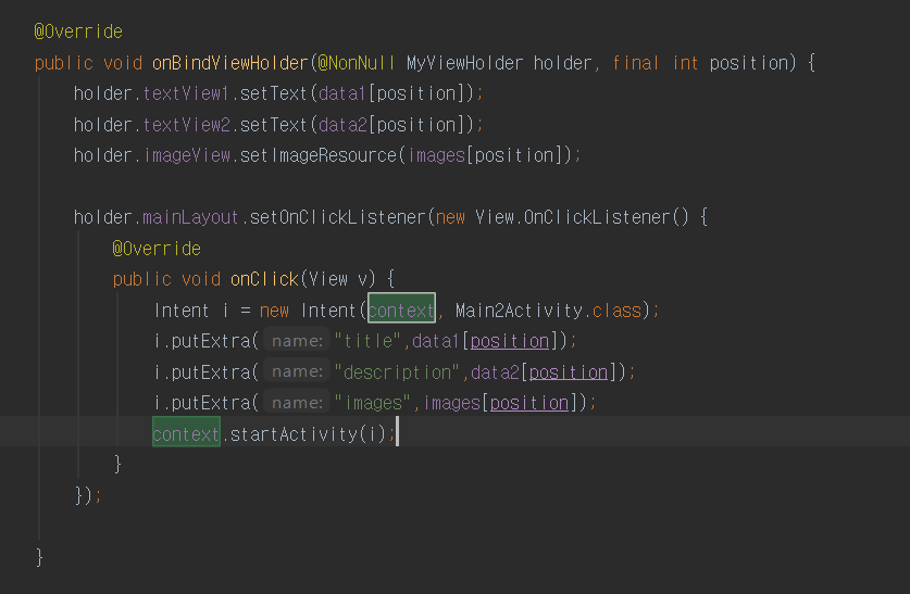 아이템이 클릭되면 자세한 설명이 있는 액티비티로 넘기기 위해 아래와 같이