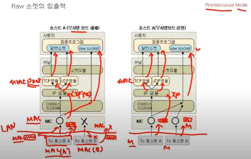 무차별 모드로 설정된 예제가 있다. 일단 일반 소켓 영역에서 말하자면 아래 그림을 보면 NIC(Network Interface Card) 에서 자신의 MAC주소와 같은