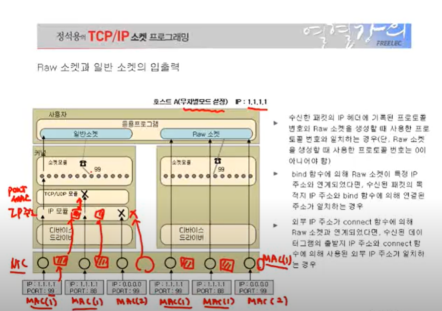 LAN 카드는 맥주소를 보게된다. 자신의 맥주소랑 같은 것을 카피한다. 이때 소켓이 일반 소켓이면 IP 모듈로 보내게 된다.
