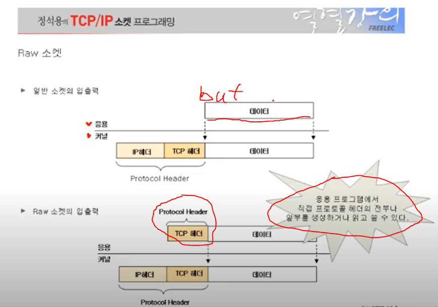 일반 소켓 같은 경우 write(socket, buffer, stream) 이런 식으로 데이터 크기정도만 조작할 수 있다. 하지만 raw 소켓 같은 경우는 응용 프로그램에서 직접 프로토콜 헤더의 전부나 일부를 생성하거나 읽고 쓸 수 있다.