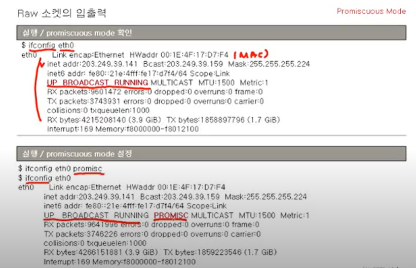 Promiscuous Mode 로 설정된 경우 자신의 맥주소와 다른 소켓도 가져오게 된다. lan에 흘러다니는 모든 소켓을 카피해버린다.