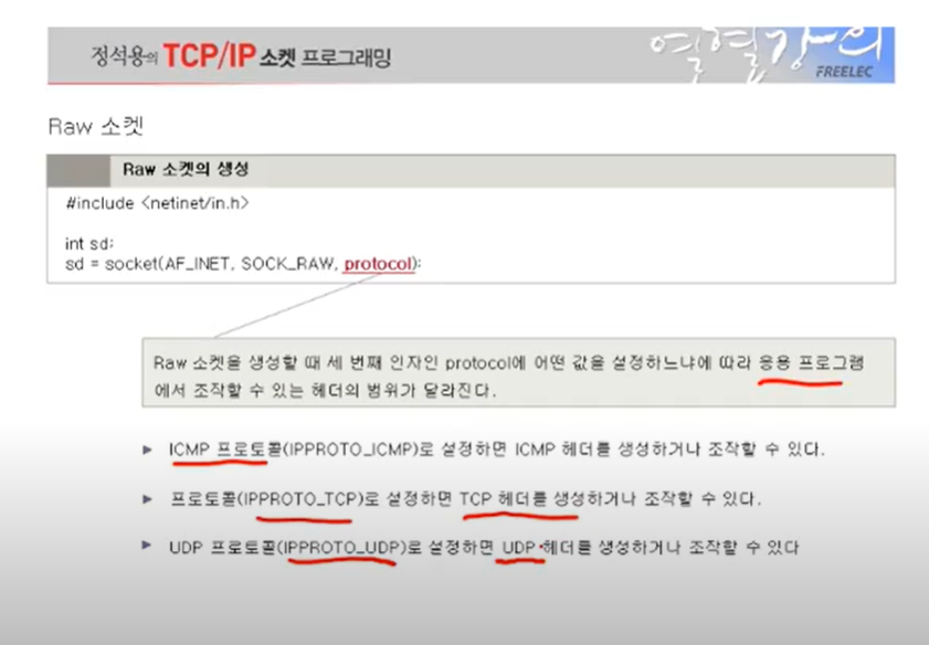 raw 소켓을 사용하는 이유는 새로운 프로토콜을 생성하거나 소켓을 새밀하게 조작하기 위해서이다.