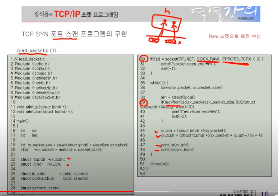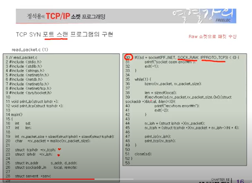 row 소켓 모드에서 tcp 프로토콜을 사용하겠다는 것을30번째 줄을 통해서 확인할 수 있다.