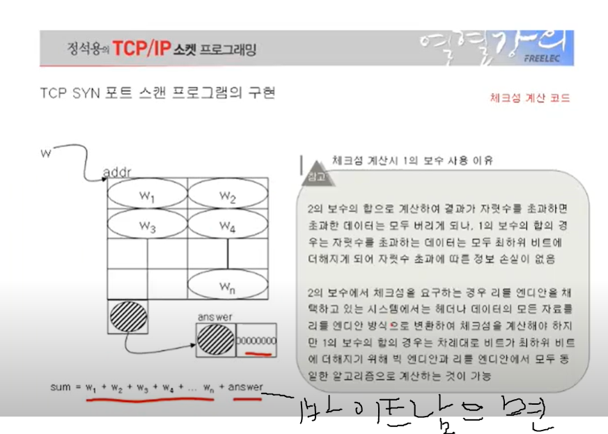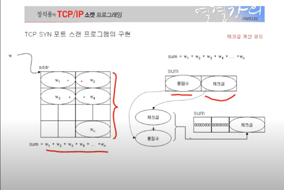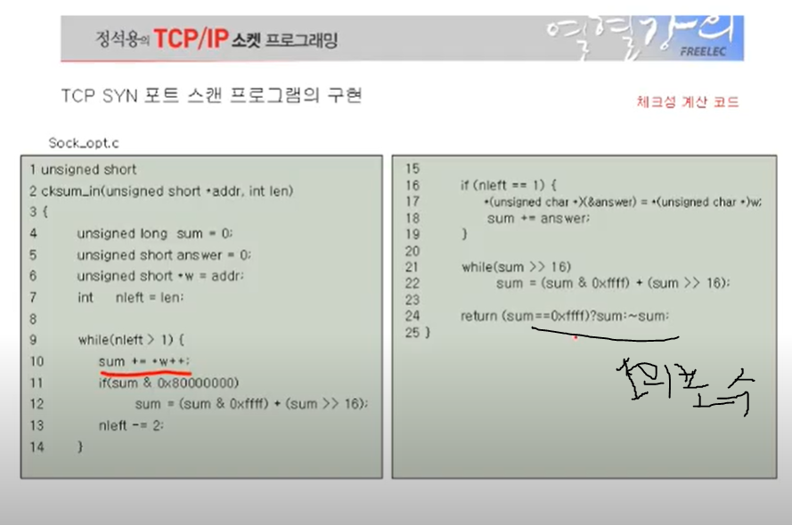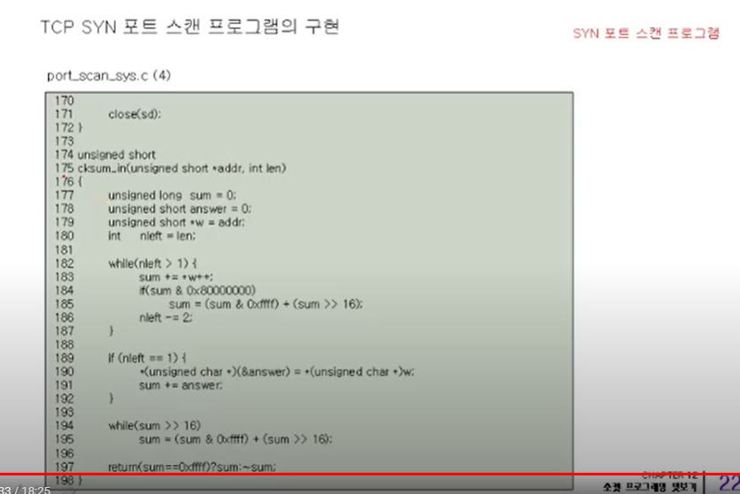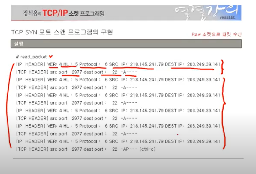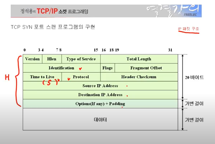 22~23 번째 줄을 보면 tcp 헤더와 IP 헤더를 설정하고 있는 것을 볼 수 있다.