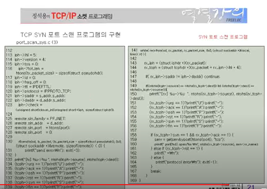 130번째 줄에 sendto를 통해 원격지로 데이터를 전송한다. SYN 메시지를 전송하는 것이다.
