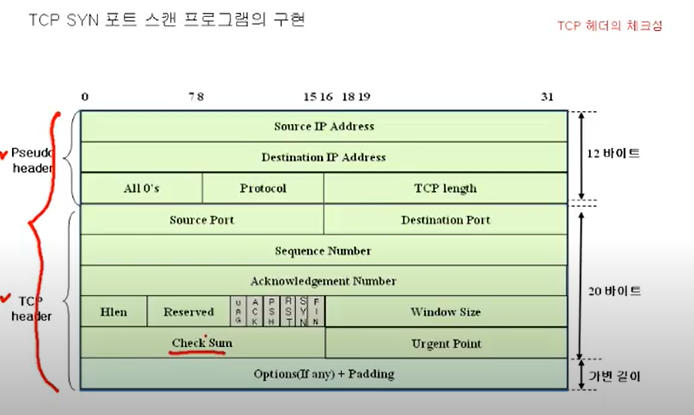 TCP 헤더의 체크섬은 Presudo(슈도) header와 TCP header 정보를 통해 만들어지게 된다.