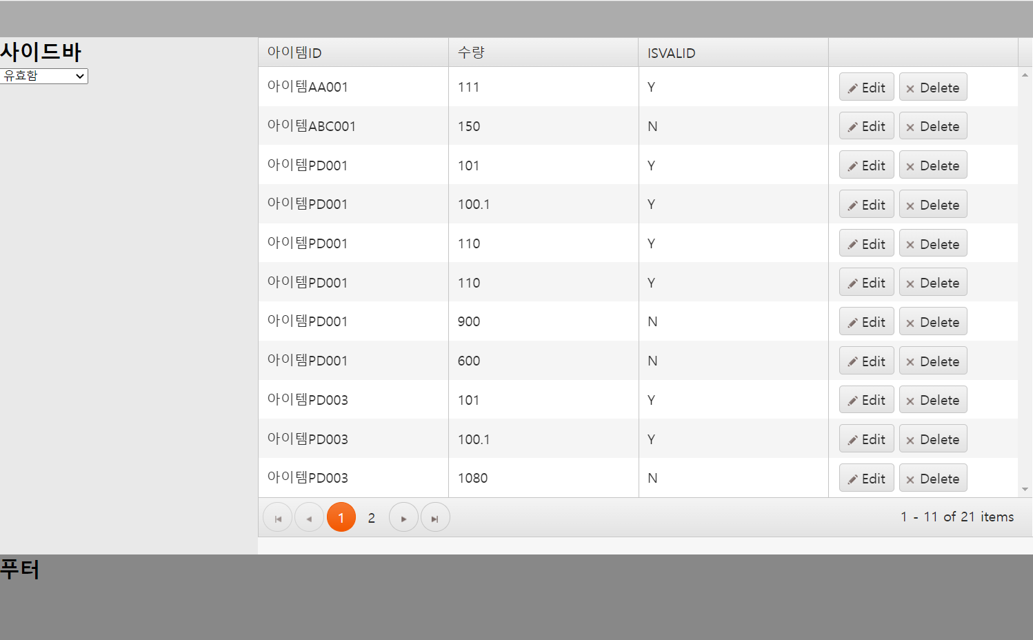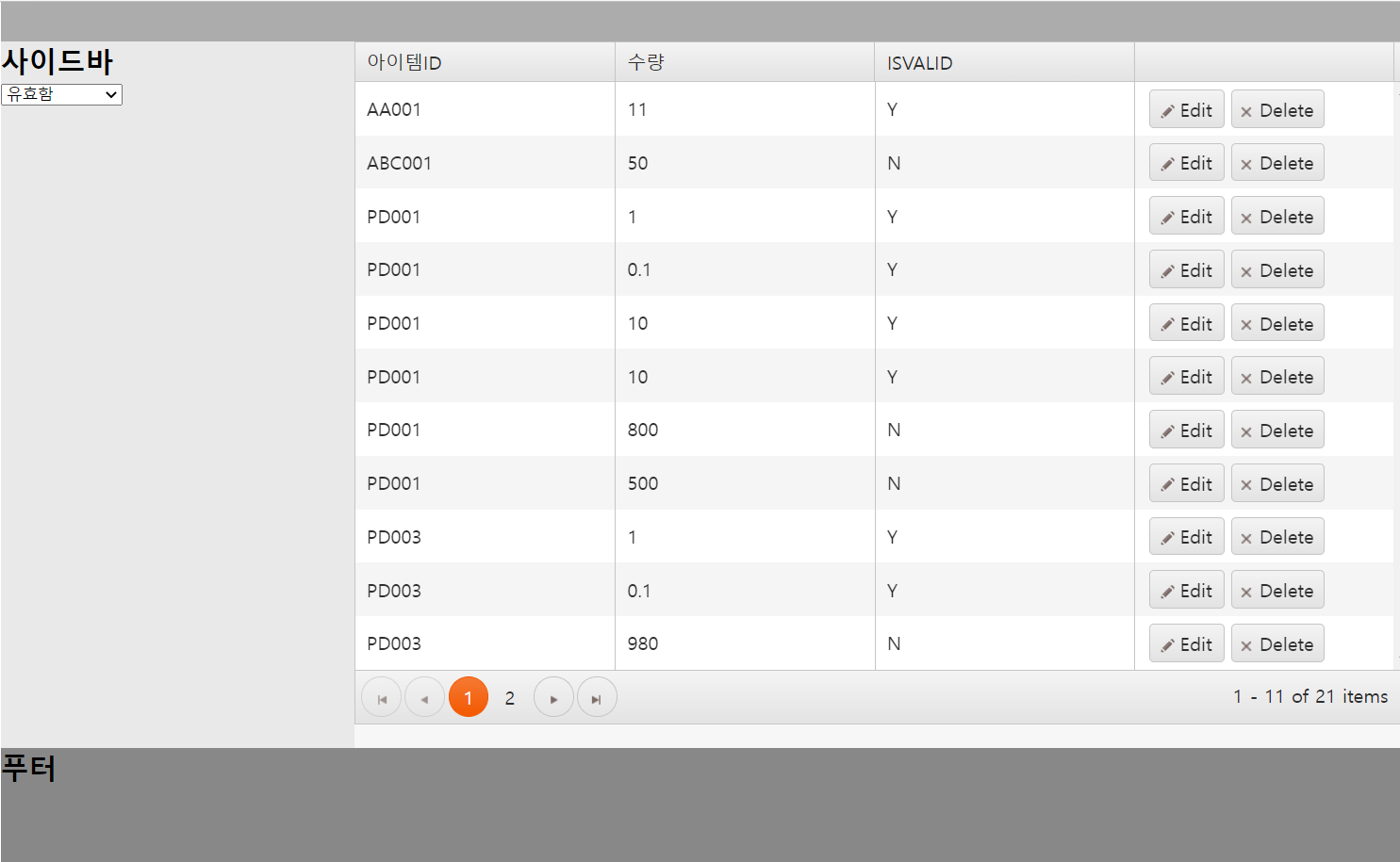 아래 화면은 제가 원하는 것을 구현한 화면입니다. 아이템 ID에는 각 아이템 ID마다 아이템이라고 붙어있고 수량은