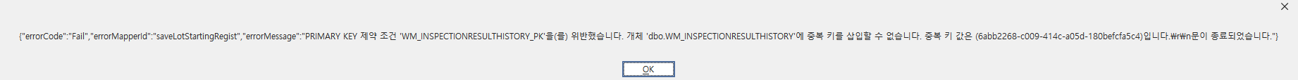errorMessage: PRIMARY KEY 제약 조건 'WM_INSPECTIONRESULTHISTORY_PK'을(를) 위반했습니다. 개체 'dbo.WM_INSPECTIONRESULTHISTORY'에 중복 키를 삽입할 수 없습니다. 중복 값은 ~~ 입니다.