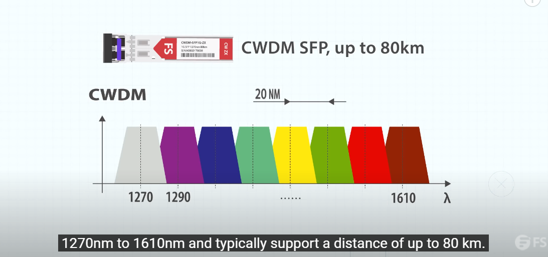 CWDM은 80KM 까지 지원 및 1270nm ~ 1610nm 주파수 대역을 사용한다.